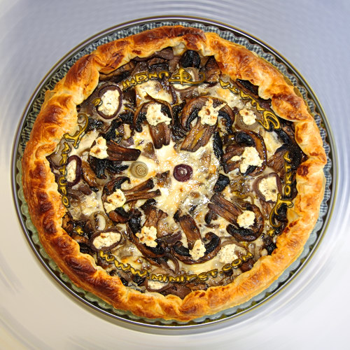 Pour mixture on the puff pastry, leaving a few pieces of mushrooms and onions for decoration.